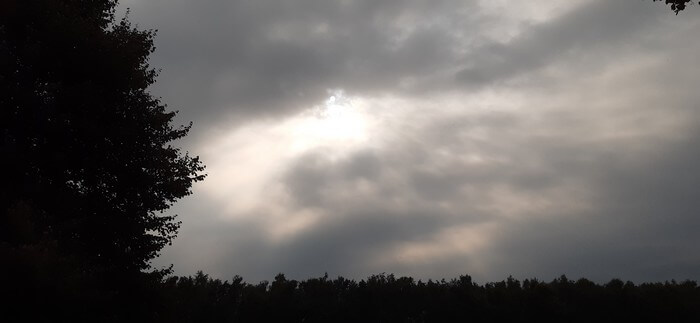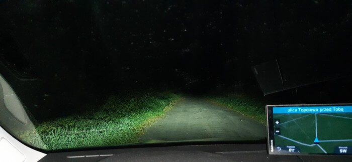 A dróżka pod lasem tylko w reflektorach samochodu.: