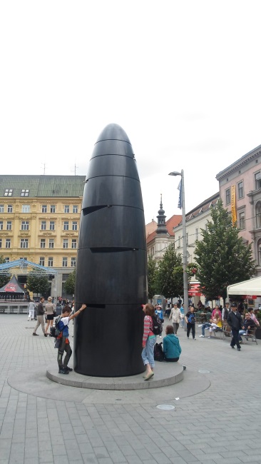 Brno, rynek. Czarny obelisk. A przecież tamtędy chodzą młode dziewczęta…