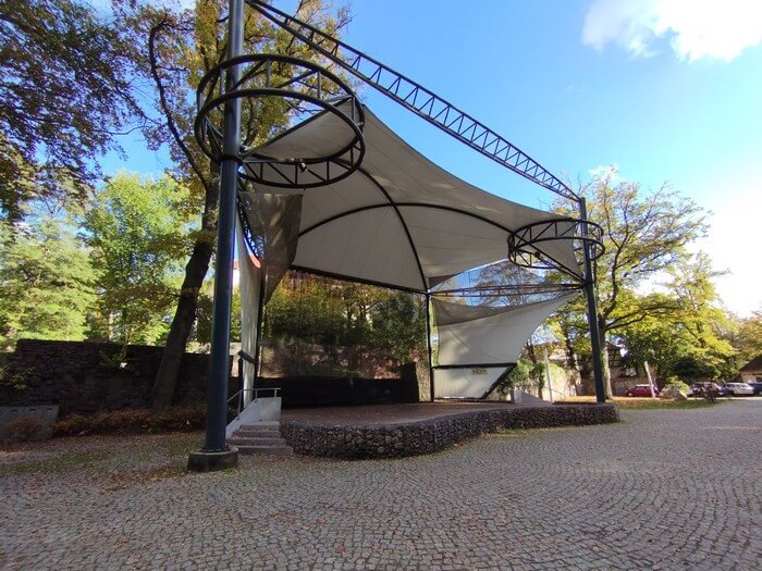 Jedziemy do teatru do Zielonej Góry, a tu SMS, że aktor się rozchorował, przedstawienie odwołane. Chcieliśmy nawet zadzwonić z poradą, że może dać mu klina i spektakl się odbędzie, ale – skręciliśmy do Łagowa. Tu – poza wszystkim – amfiteatr, w którym słuchaliśmy śp. Wojciecha Karolaka.: