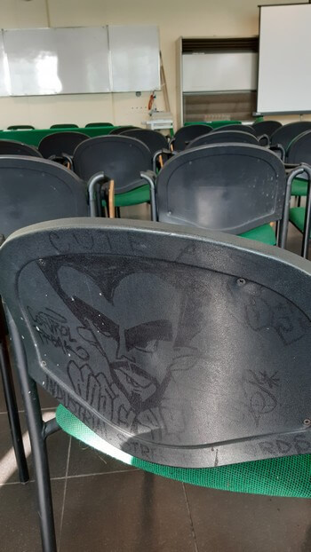Na chwilę przed egzaminami przechadzam się po sali i na oparciu siedzenia widzę malunek, który jakiś student naniósł w trakcie wykładu. To musiało być u mnie. Tylko moje monologi bywają tak nudne.: