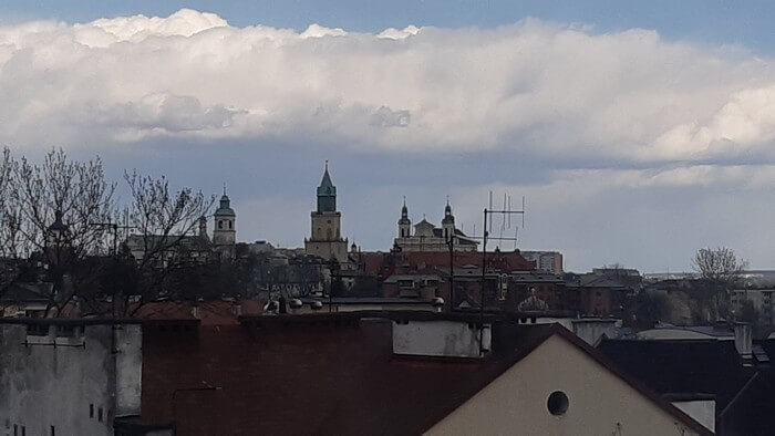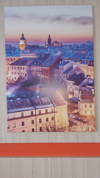 Jesteśmy w podróży służbowej i tylko dzięki temu mamy hotel. Miasto ze zdjecia na ścianie, miasto widziane z okna.: