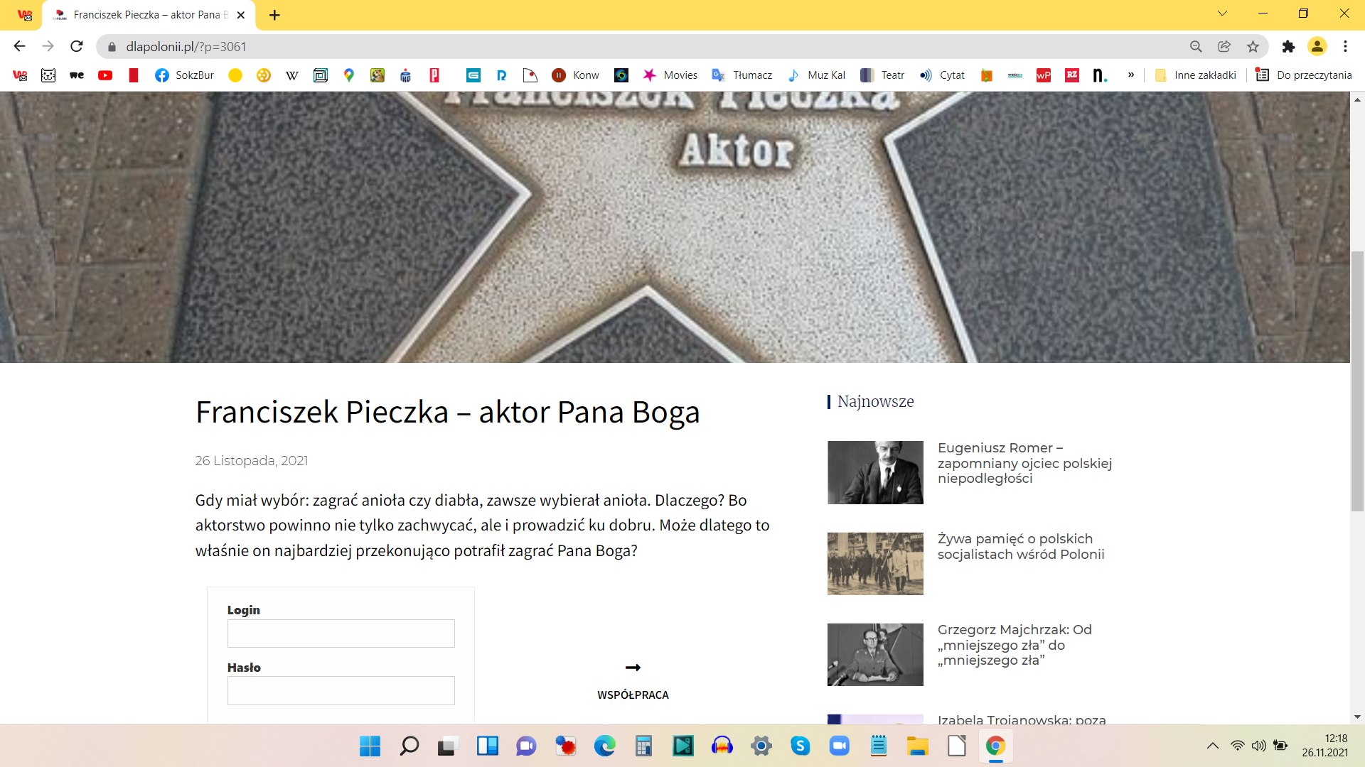 Alma 27 listopada 2021Co niesie dzieńWiesław Kot Nic tak człowieka nie rozrusza jak Alma Mater o poranku.: Na portalu dla Polonii tekst o Franciszku Pieczce.: Odsłuchane po lasach, za kierownicą. Nadspodziewanie dobre, zwłaszcza u pisarza amerykańskiego. Dla niewidomych czytał Leszek Teleszyński.: