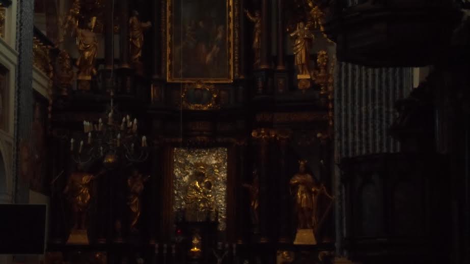 a już nas przechwycił jezuita-staruszek. Pierwsi pielgrzymi tego dnia! Jak się dowiedział, że my z Poznania, to od razu mu się przypomniało, że w 1956 roku miał tam wycinany wyrostek i zapamiętał pewną śliczną pielęgniarkę ze szpitala im. Pawłowa (teraz, po dekomunizacji, szpital oczywiście nosi miano Przemienia Pańskiego). Nie spytaliśmy o szczegóły pielęgnacji okolic wyrostka przez śliczną pielęgniarkę, bo nie było czasu. Duchowny zaciągnął nas przed cudowny obraz: