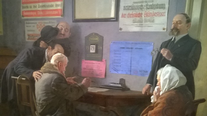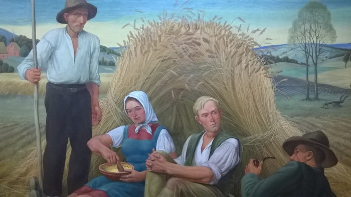 Przejawy sztuki faszystowskiej. Odpoczynek zdrowych narodowosocjalistycznych żniwiarzy i żydowscy spekulanci wywłaszczający biedą austriacką rodzinę.:
