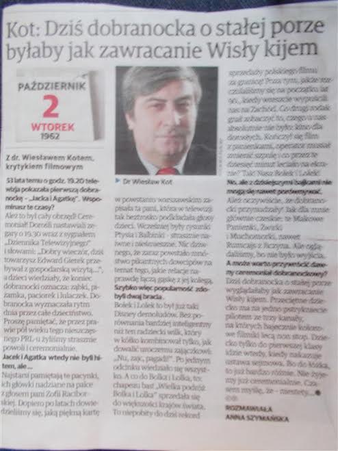 Głos Wielkopolski pyta o dobranocki w związku z kolejną rocznicą pierwszego programu z Jackiem i Agatką. Zacytuję siebie: „A co do Bolka i Lolka, to: chapeau bas! >Wielka podróż Bolka i Lolka< sprzedała się do większości krajów świata. To niepobity do dziś rekord sprzedaży polskiego filmu za granicę! Poza tym, jakże rozczulaliśmy się na początku lat 90. kiedy wreszcie wypuścili nas na Zachód. Co drugi rodak gnał zobaczyć to, czego u nas absolutnie nie było: kino dla dorosłych. Kończył się film z panienkami, operator musiał zmienić szpulę i co przez te dziesięć minut leciało na ekranie? Tak! Nasz Bolek i Lolek!”: