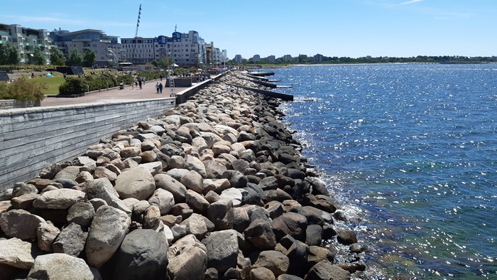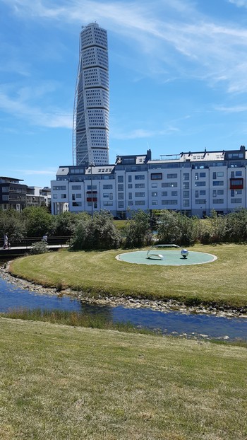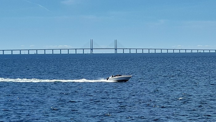 Wczoraj o tej porze szedzkie Malmo w części plażowej. Oni tu nawet prostego wieżowca postawić nie potrafią. Na horyzoncie most nas Sundem, przez który za chwilę pojedziemy do Danii.: