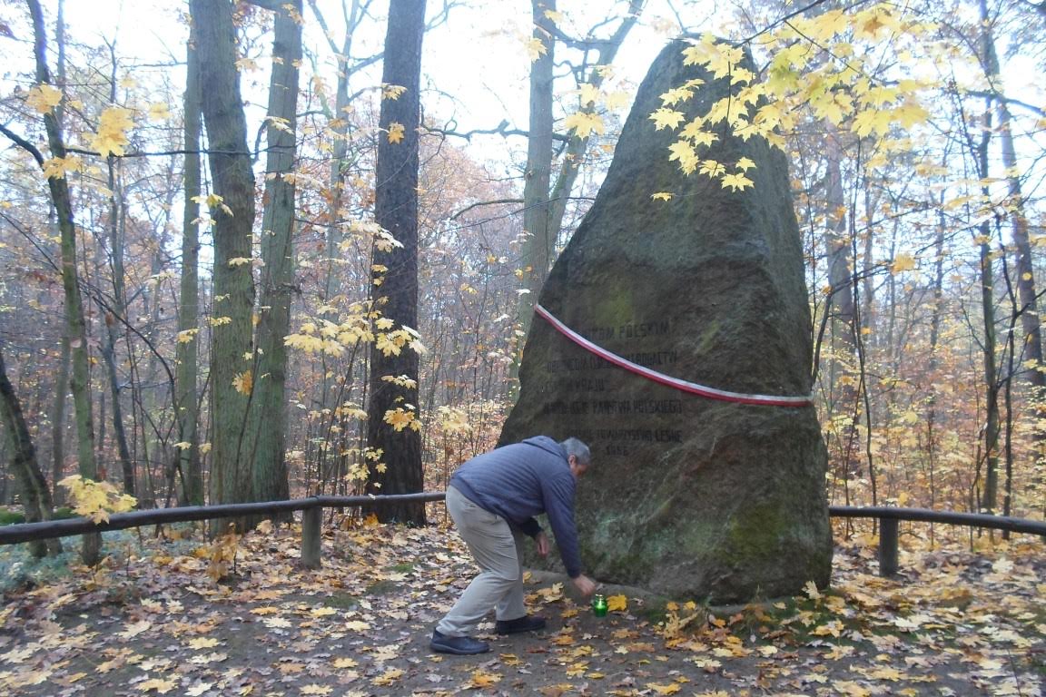 Potem ruszyliśmy się autem. Nie mamy naszych zmarłych w Poznaniu, więc znicz tradycyjnie pod głazem poległych leśników.: