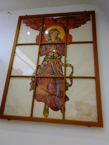 Karton witrażowy Józefa Mehoffera. Artysta miał zwyczaj, że szkicował tylko ogólny zamysł i zostawiał pola do wypełnienia swoim współpracownikom. Mój ideał.: