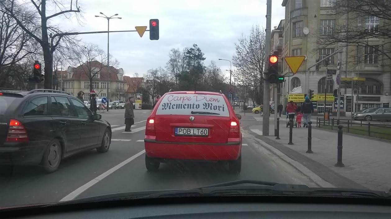 Samochód przede mną ma napis: Carpe diem, Memento mori. Jutro Wielki Piątek – część napisu powinien usunąć.:
