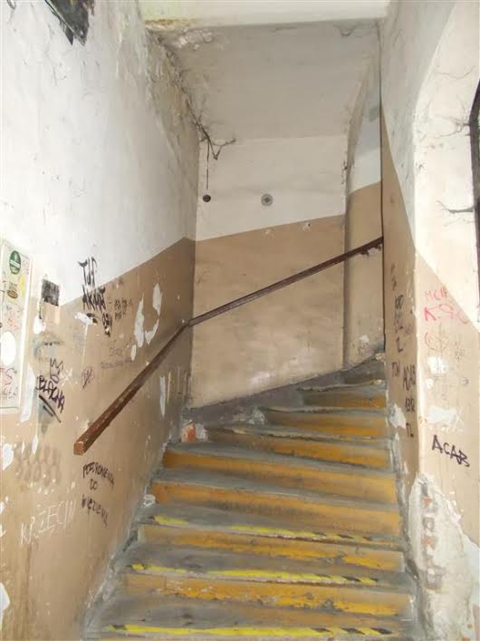 Kraków. Dorota zaciągnęła mnie do czegoś w rodzaju „gabinetu strachu”. Mieści się toto przy Floriańskiej, tuż obok Kościoła Mariackiego. Na tyłach kamienicy jak ze slumsu.:
