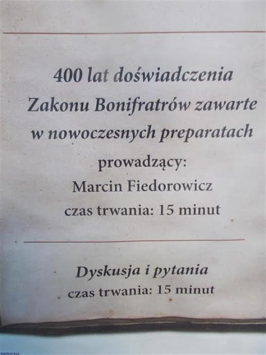 Na przykościelnej tablicy ojcowie Bonifratrzy zapraszają na kurs ziołolecznictwa, co z miejsca mnie zainteresowało. Ale – co to? Wykład o tradycjach ziołoleczniczych w tym zakonie, które liczą sobie 400 lat, ma trwać tylko 15 minut? A nie, przepraszam, jeszcze kwadrans na dyskusję. A skoro tak, to w porządku.:
