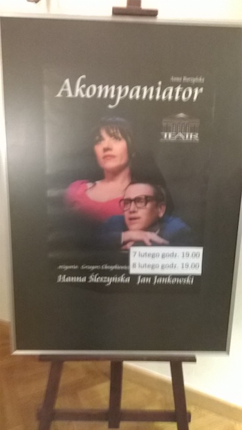 Wieczór w Gorzowie Wlkp., w tamtejszym teatrze na importowanej ze stolicy sztuce „Akompaniator”. Hanna Śleszyńska i Jan Jankowski. Miejscami mocno pieprzne, ale publiczność to uwielbia.: