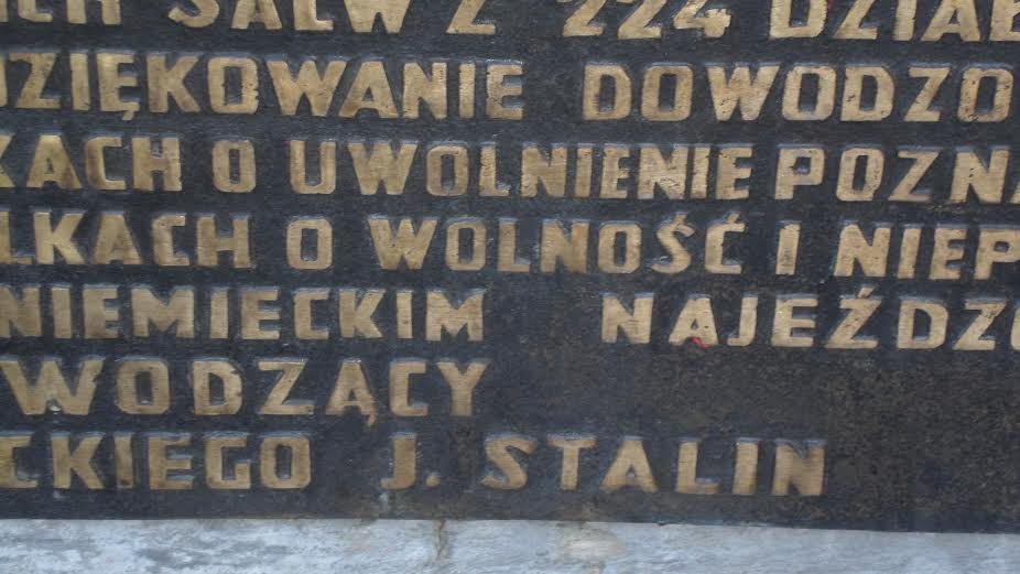 Bo ten główny pomnik, z którego przed paroma laty strącono czerwoną gwiazdę, nadał prezentuje podziękowanie tow. Stalina wykute w brązie.