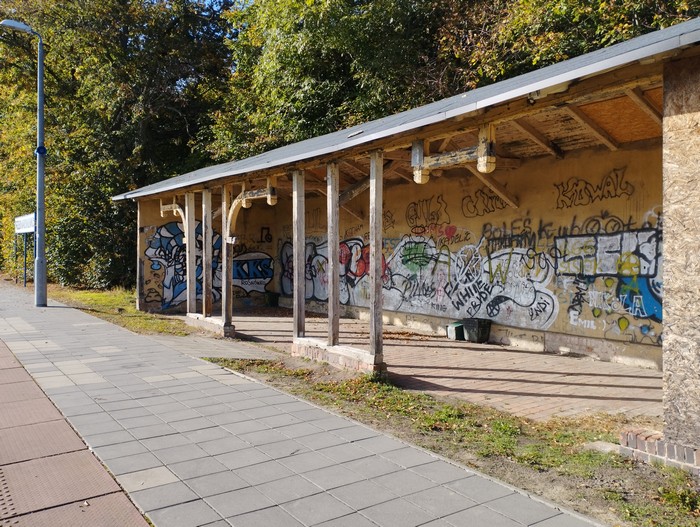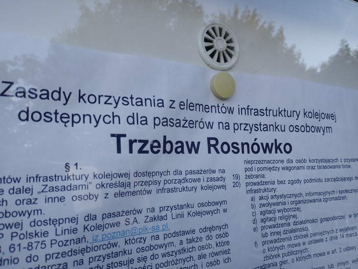 Na stacji Trzebaw-Rosnówko, czyli u celu moich nieustannych peregrynacji, pojawiło się sążniste obwieszczenie urzędowe. Nieprzpadkiem. Bowiem od pewnego czasu stacyjna wiata stała się wziętą domówką. Nieopodal sklepik spożywczno-monopolowy, a dookoła lasek, gdzie można piwo oddać naturze.: