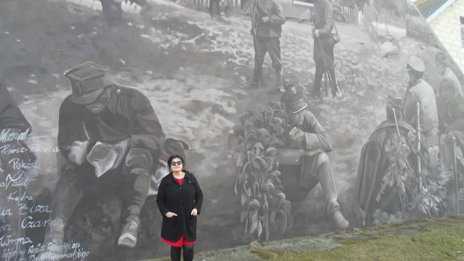 Wizna. Na ścianie budynku graffiti na podstawie zdjęcia, które dokładnie w tym miejscu zrobiono 10.09.1939. Polscy jeńcy. Dorota twierdzi, że ten po jej lewej stronie wysyła do domu SMS-a, że przez pewien czas będzie niedostępny.