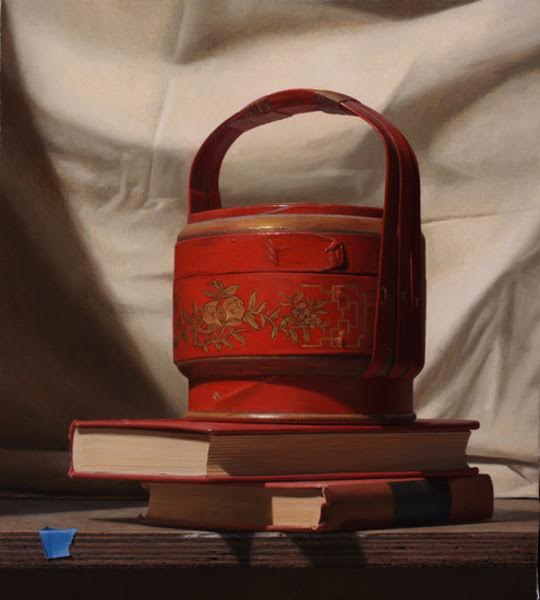 Malarz amerykański Tony Curanaj (*1973) „Czerwony czajnik i książki”. Też mam w domu sporo książek, do których nie zaglądałem od lat. Nie wyrzucam ich jednak. Podobnie jak autor obrazu uważam, że jeszcze mogą się przydać. A to stół ma jedną nogę krótszą, a to akurat zabrakło czegoś, na czym można by imbryk postawić…: