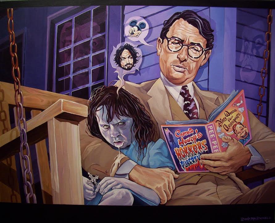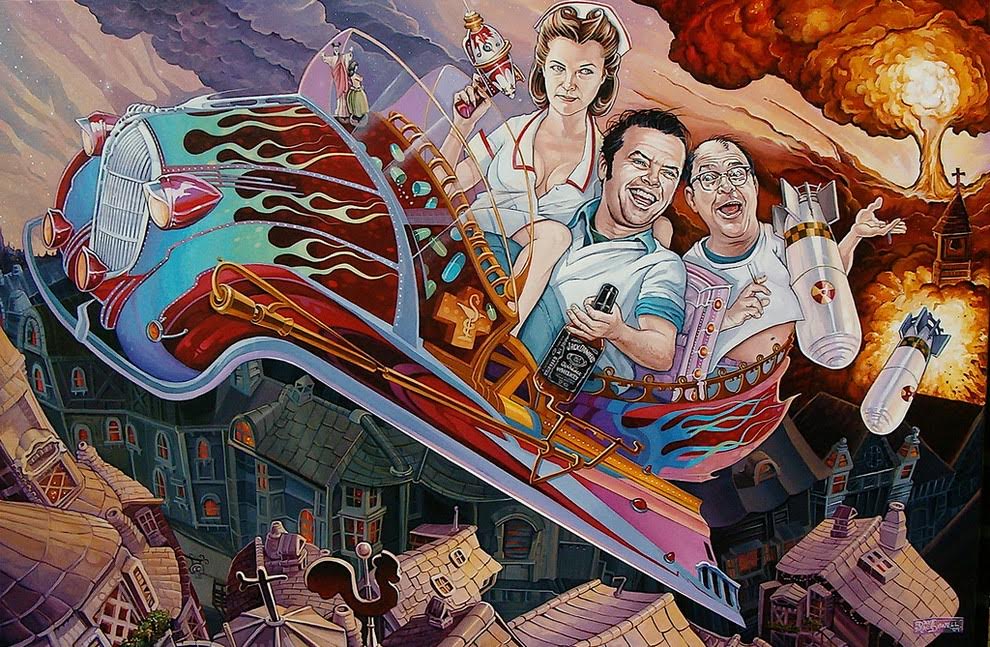 Dave Macdowell maluje postacie z historii kina. Najczęściej ironicznie. Tu słynna scena gry w rosyjską ruletkę z „Łowcy jeleni”.: