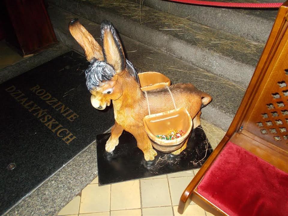 Kórnik. Żłóbek w kolegiacie. W nosidełkach cukierki dla dzieci. Za darmo. No, nie całkiem, bo obok stoi aniołek. Jak się wrzuci dwa złote, to kiwa główka tak intensywnie jak muzycy AC/DC na koncercie.: