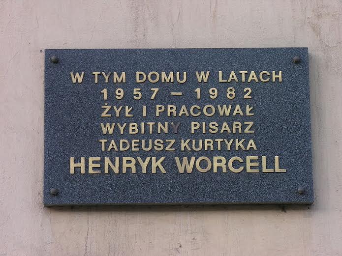 To jest ten (właściwe nazwisko: Kurtyka), który napisał przed wojną „Zaklęte rewiry”. O zawodowym i prywatnym życiu kelnerów. Poeci z kręgu „Wiadomości Literackich” z Tuwimem na czele zachwycali się, że tyle tam „prawdy życia”. Mnie nigdy nie udało się przebrnąć. W każdym razie pamiętamy świetny film Majewskiego z Wilhelmim i młodziutkim Kondratem. A ten Worcell przeprowadził się po wojnie z Krakowa w Kotlinę Kłodzką i dalej pisał reportaże „z życia wzięte”. Czyli złodziejstwo, pijaństwo, kumoterstwo itd. osadników na Ziemiach Odzyskanych. Co kosztowało go ileś tam pozwów sądowych oraz utratę oka w bójce z jednym z opisanych. W rezultacie przeprowadził się do Wrocławia i dokonał życia jako miejscowy literat. Stąd ta księgarnia. Oraz tablica pamiątkowa (fot: Internet):