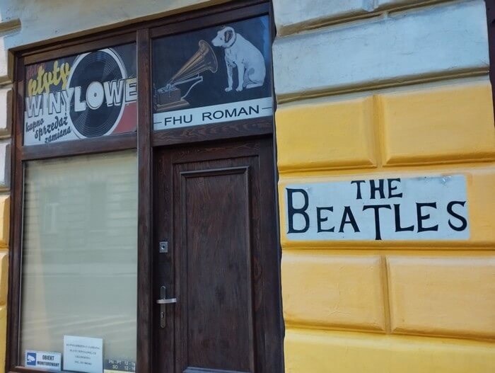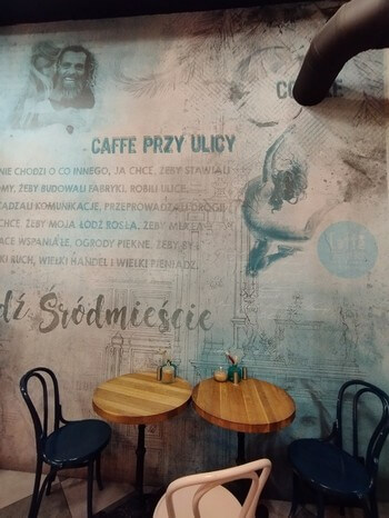 Kawka przy Piotrkowskiej z tą słynną inskrypcją z „Ziemi obiecanej”.: