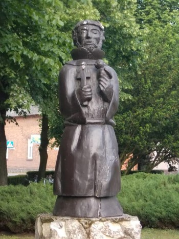 Na ryneczku – św. Franciszek jako miłośnik ptaków. Co widać w dłoni i na głowie.: