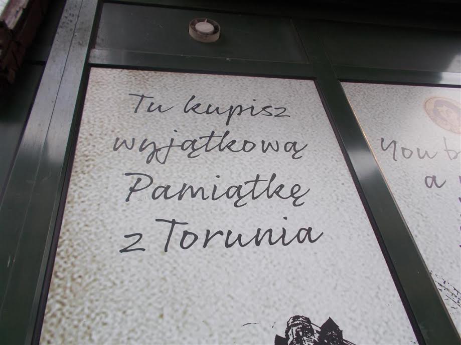 A w Toruniu szukaliśmy jeszcze sklepu z pamiątkami. Jest! Spojrzałem jednak powyżej tego napisu, a tam: „Sklep monopolowy”.: