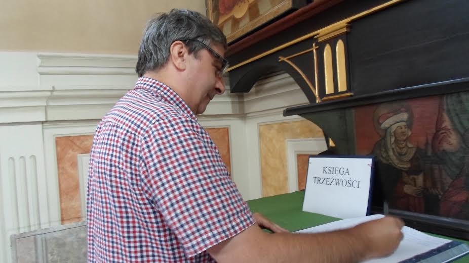 Kiedy w Kaliszu, w Kolegiacie św. Józefa zobaczyłem wyłożoną na ołtarzu „Księgę trzeźwości” nie wahałem się ani sekundy. Skoczyłem i wpisałem, że „już nigdy”, że „ani kropli”. Może na ten poryw serca miał wpływ fakt, że następnego dnia w tym miejscu miał być zjazd rodziny Radia M.? W każdym razie, kiedy wychodziłem z Kolegiaty, natknąłem się na pana potrzebującego. A że ja sam nie mogłem, bo przed chwilą podpisałem, a przecież za zdrowie Doroty i moje powinno jednak być wypijane, bo przed nami droga daleka, więc…: