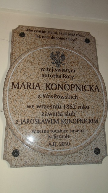 W kolejnym kaliskim kościele natknąłem się na przykład kazirodztwa. I to takiego, które upamiętniono marmurową tablicą. Bo stoi tam, że Maria Konopnicka w tej świątyni poślubiła Jarosława Konopnickiego. Coś nie teges. A przecież było tak, że Konopnickiemu ślubowała Maria Wasiłowska, która dopiero w następstwie tego faktu stała się Konopnicką. No tak, ale jak by napisać na marmurze, że jakaś Wasiłowska wzięła tu ślub, to co to za sensacja?:
