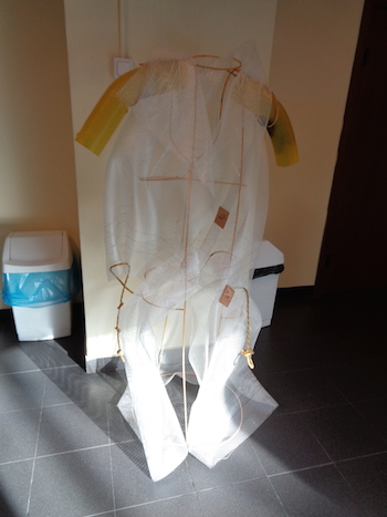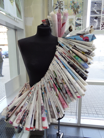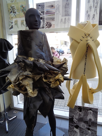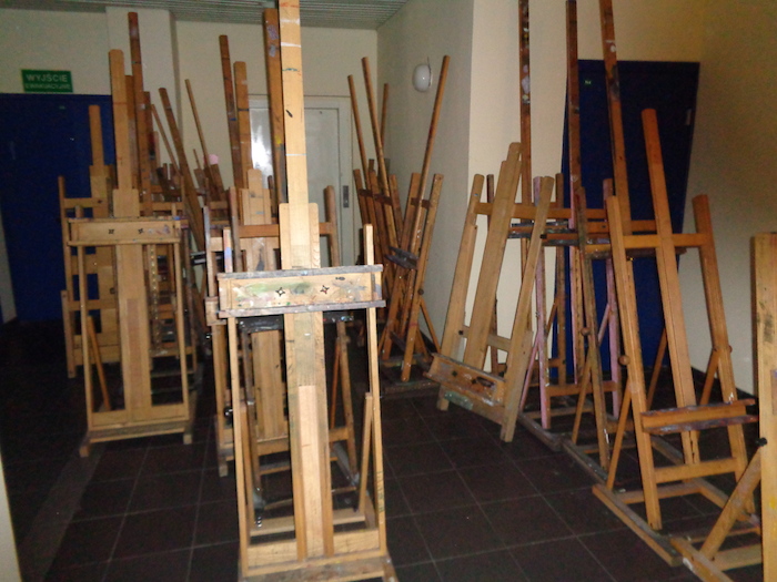 Pierwsze zajęcia w sezonie (z zaocznymi). Na mojej Alma Mater penthouse pusty na pięć minut przed pierwszym dzwonkiem. Puste (na razie) sztalugi – już sobie wyobrażam, jakie dzieła niebawem na nich powstaną. A po poprzednim sezonie pozostały projekty sukien, w tym jedna na bal prasowy.: