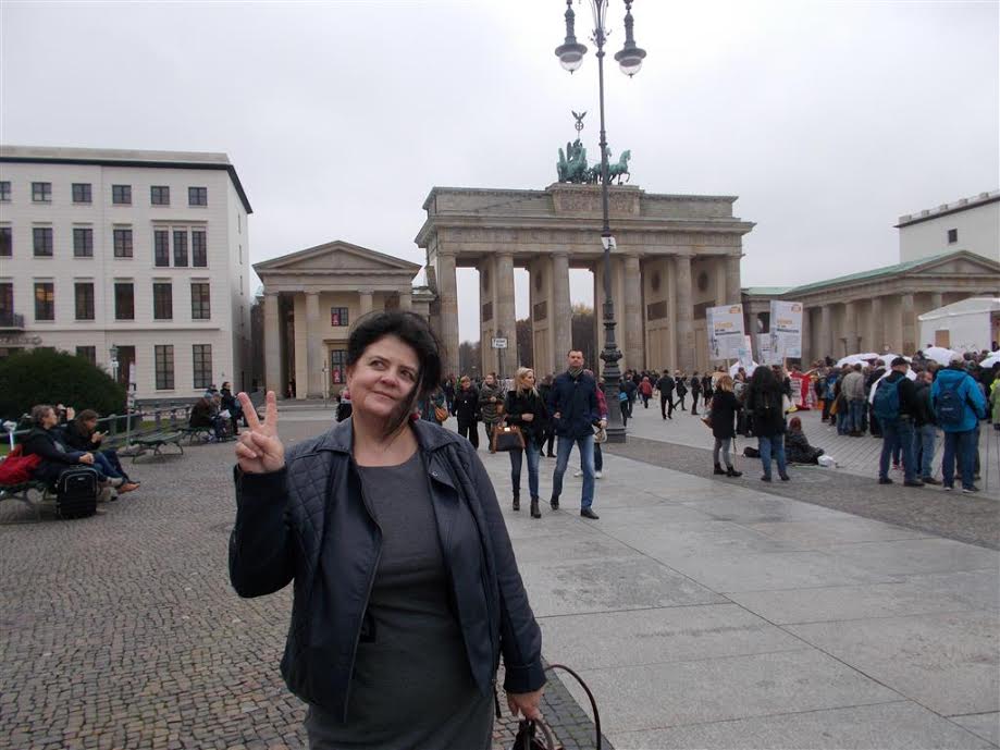 Dorota świętuje (11.11.) naszą Niepodległość. Musiałem ją trzymać siłą, bo koniecznie chciała zatknąć biało-czerwoną flagę na szczycie Bramy Brandenburskiej! Ale to już było w tylu filamach…: