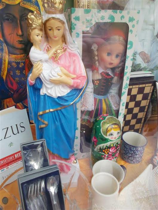 Brodnica. Sklep z dewocjonaliami, dział kobiecy. Pełen asortyment: Matka Boska, lalka w lokalnym stroju i matrioszka.: