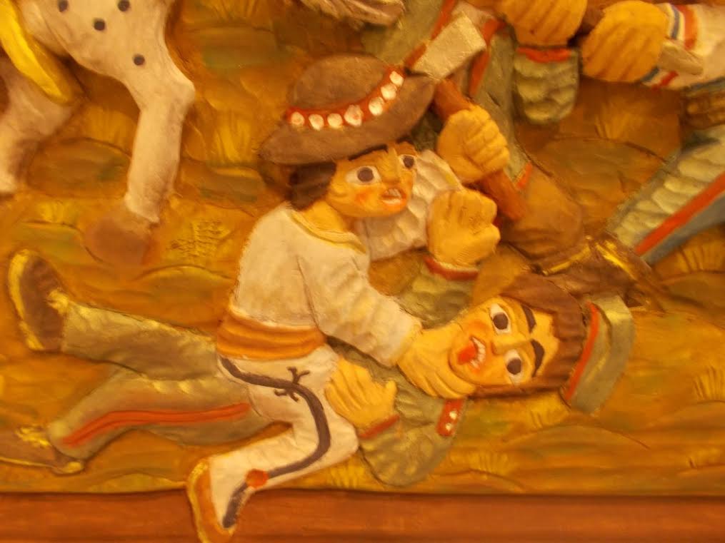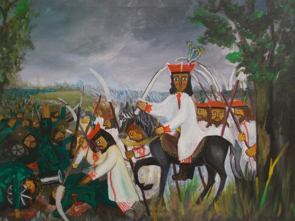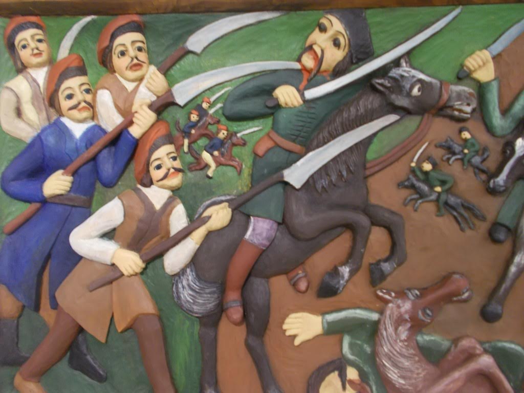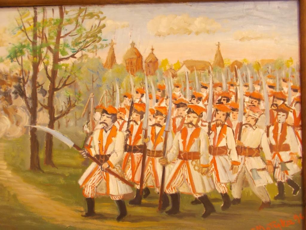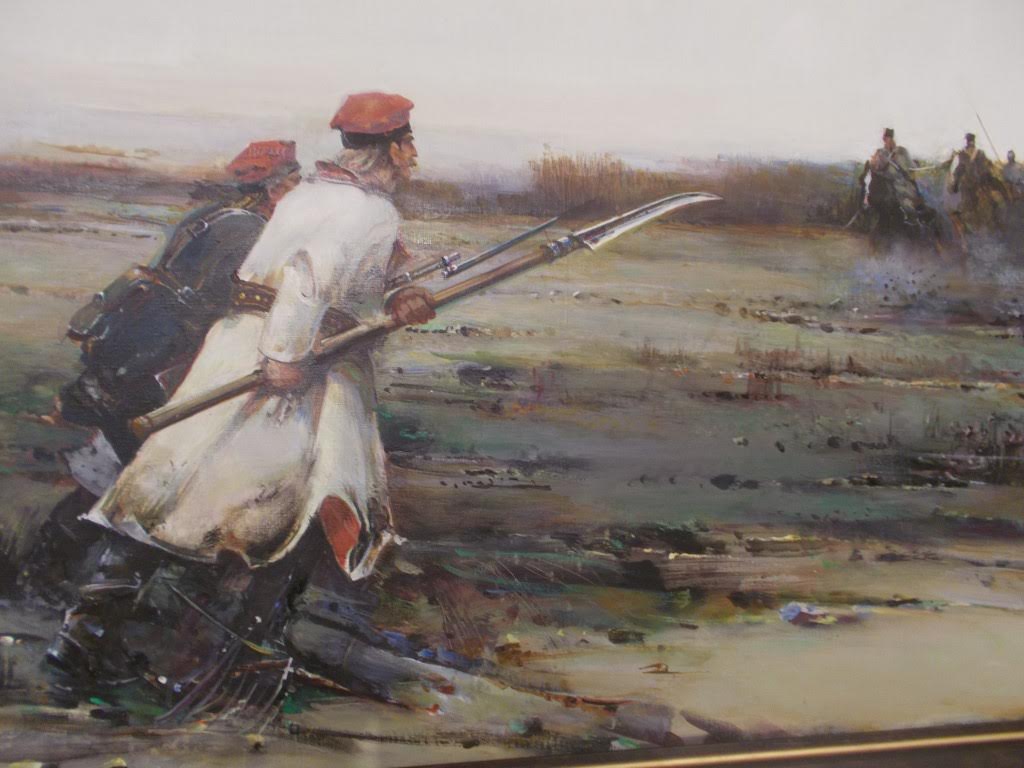 Była też wystawa prac przedstawiających kosynierów pod Racławicami. Co mówi tutaj jeden do drugiego? Podejrzewam, że: „Masz zabić każdego uzbrojonego skurwysyna, zanim on mnie zabije. Rozumiesz?!”: