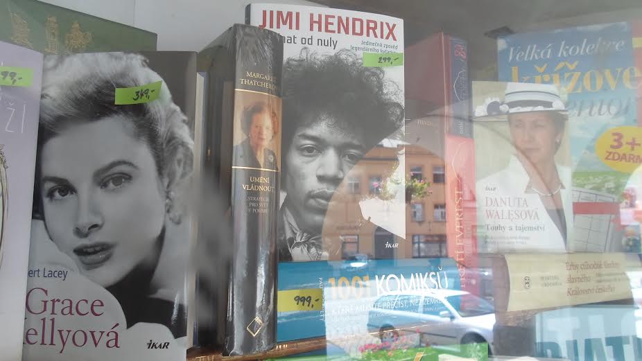 W uroczym miasteczku Jaromierz niewielka księgarenka. W witrynie, na najwyższej półce, nazwiska tych postaci, które widocznie miejscowych Czechów elektryzują najmocniej. Od lewej: Grace Kellyova, Jimi Hendrix, Margaret Thatcherova i Danuta Wałęsova.