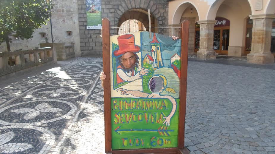 W miasteczku Jiczyn ciągle żywa jest legenda rozbójnika Rumcajsa (muzeum!). Nic więc dziwnego, że zrobiłem sobie w charakterze Rumcajsa zdjęcie. Miejsce Hanki pozostało puste, bo Hanka (czyli Dorota) zajmowała się fotografowaniem. Tylko te głupie uwagi: „- Chłop jak zwykle się puszy, a baba do roboty”: