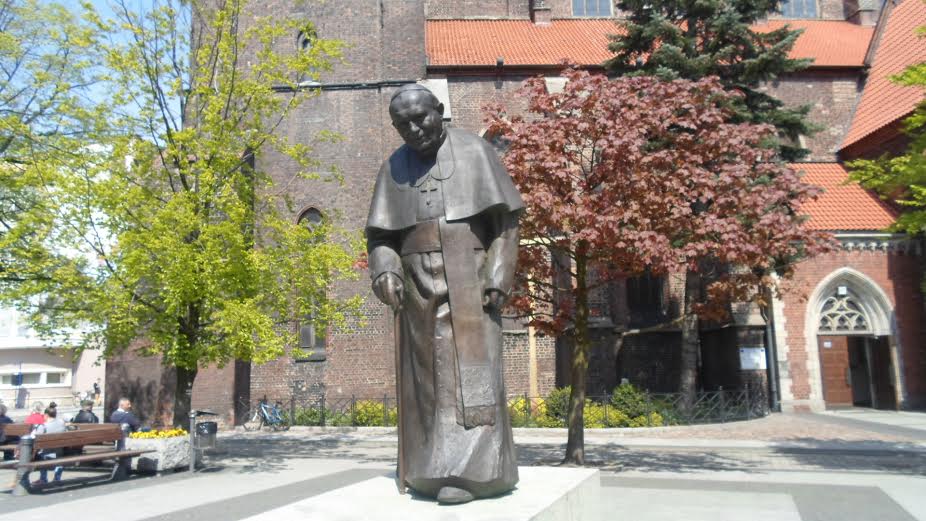 Obok kościoła pomnik kroczącego Papieża. Sprawia wrażenie, jak by chciał przejść przez pobliską ulicę.: