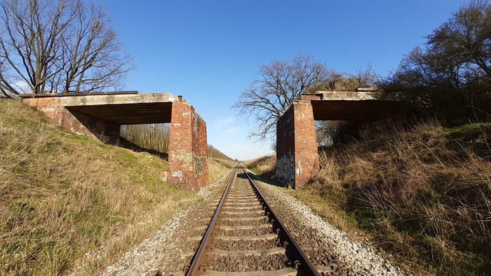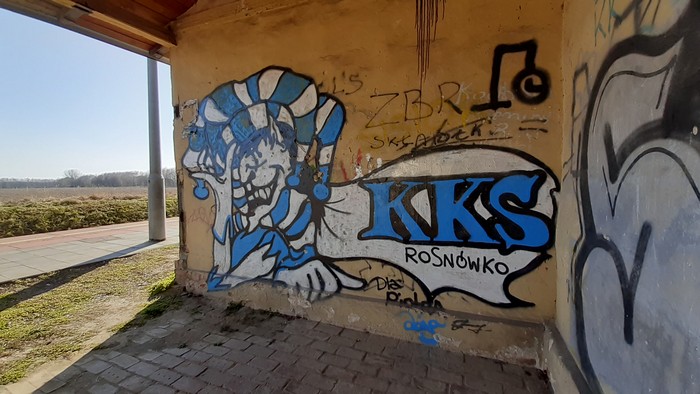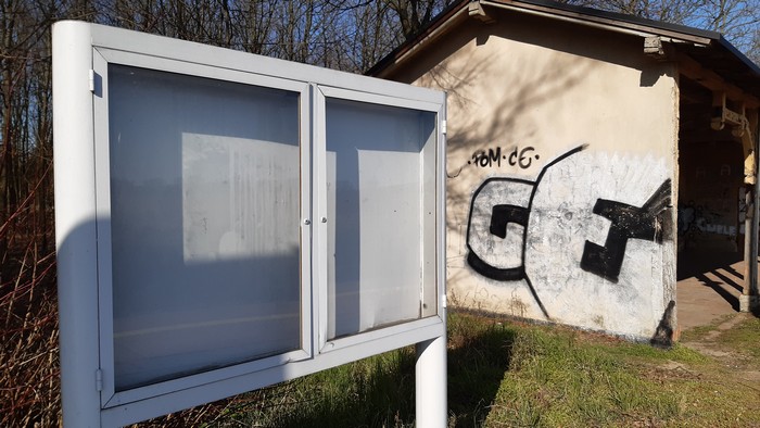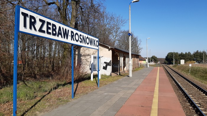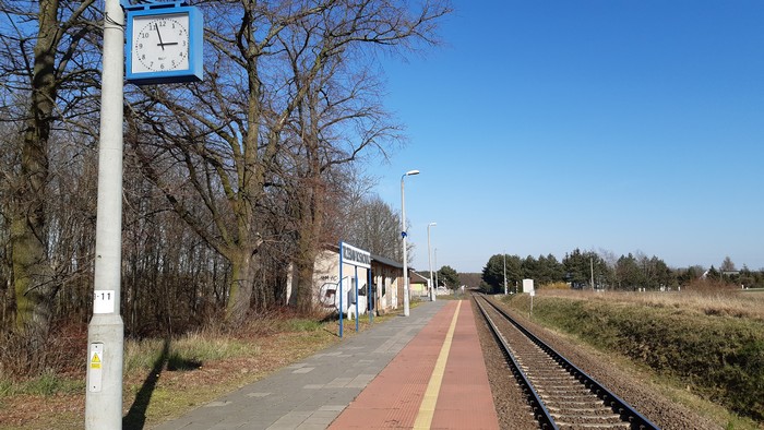 Stacyjka w Trzebawiu. Szynobus Poznań – Wolsztyn przyjechał pusty i pusty odjechał. Tablica ogłoszeń nie przewiduje żadnej przyszłości. Poza tym w oddali sarenki (te same co zwykle), czarny bez (proszę bez głupich skojarzeń!), a dookoła (chodzę po polach, lasów unikam) pogoda jak drut.: