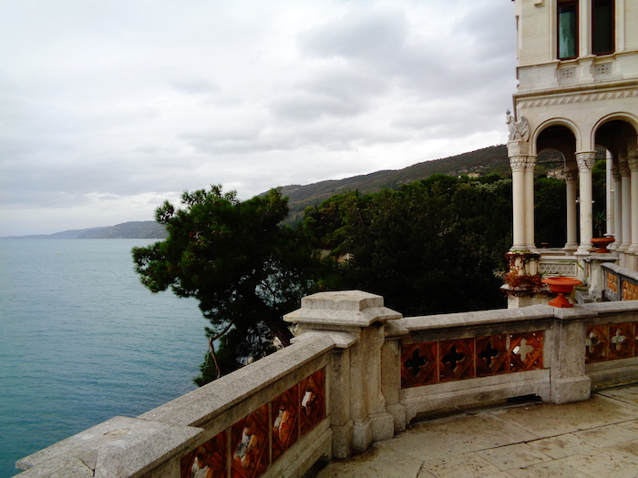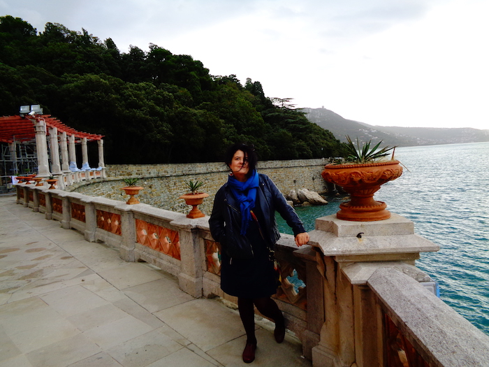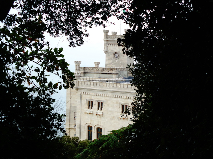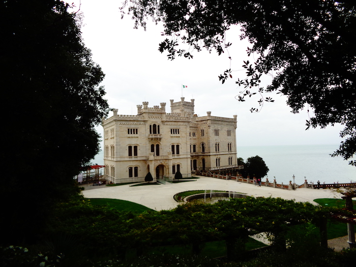 Triest. Centrum takie se, w Poznaniu czyściej. Zamek Miramare sporo powyżej. W parku z szalenie zielonymi piniami.