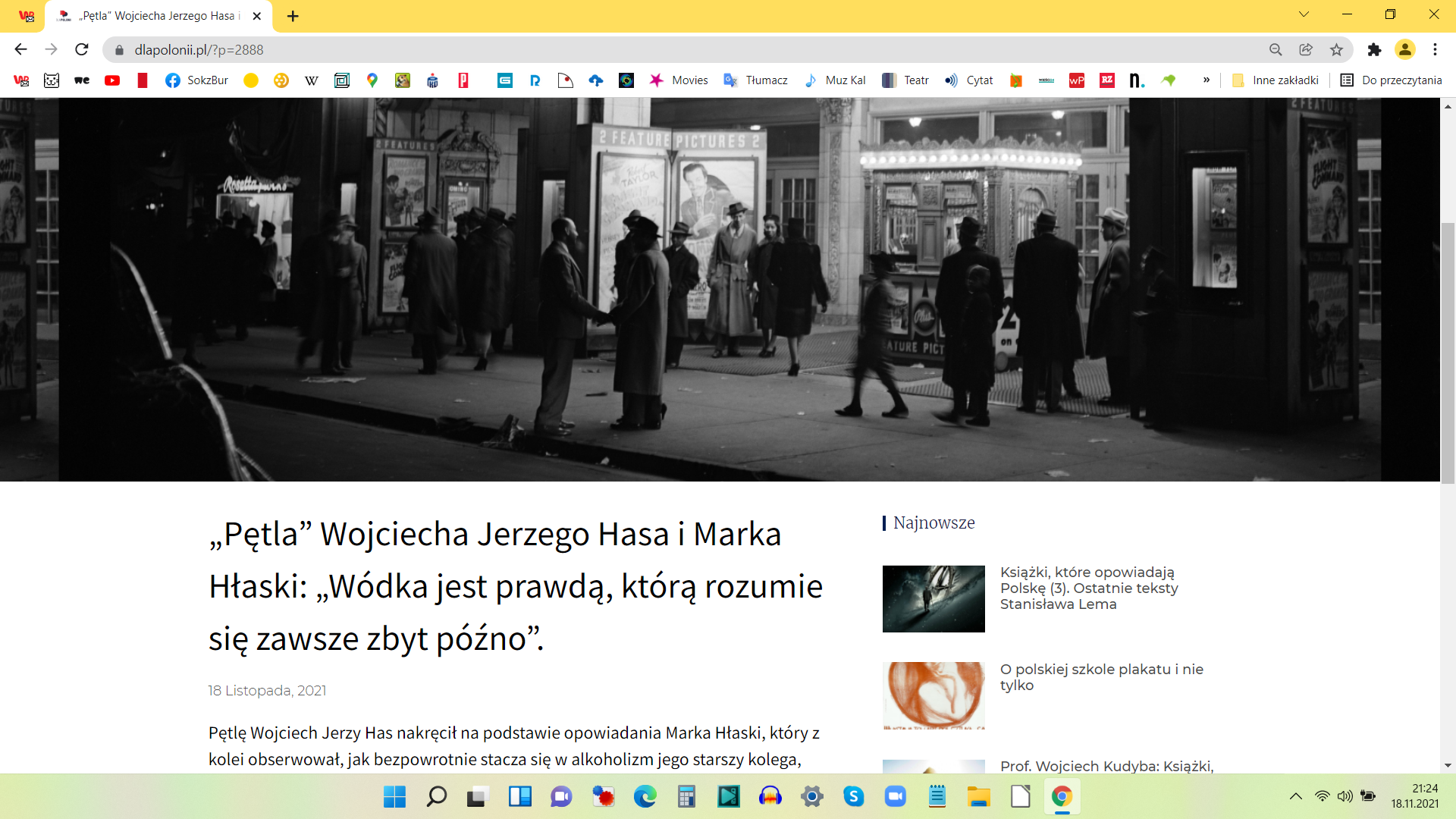 Ja dałem Podwawelską… 20 listopada 2021Co niesie dzieńWiesław Kot Jak nie można inaczej, to nad jezioro choćby na chwilę.: Wczoraj w poznańskim kinie Rialto film Maurycego Polewskiego. Rosną nowe kadry. Po drodze reklama jakże filmowej kiełbasy.: Na portalu dla Polonii tekst o „Pętli” W.J.Hasa.: