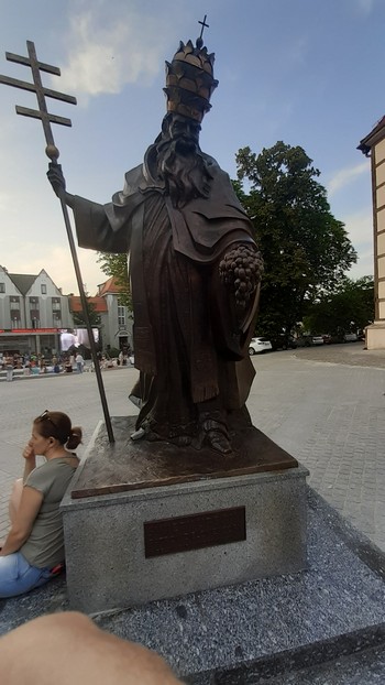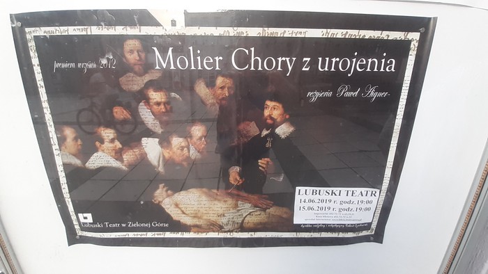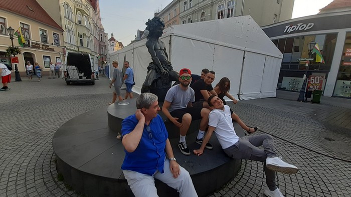 Wieczorem Zielona Góra. Molier w ironicznej adaptacji. Nawet interesujące. Z młodzieżą przy pomniku Bachusa. To się nazywa sztafeta pokoleń.:
