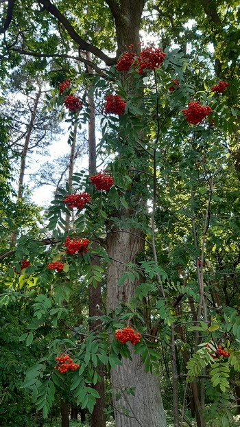 Nareszcie dłuższa trasa po lesie zamiast tego ciągłego wożenia pupska. Pierwsza jarzębina. A była Statua Wolności całkiem już porosla zielskiem.:
