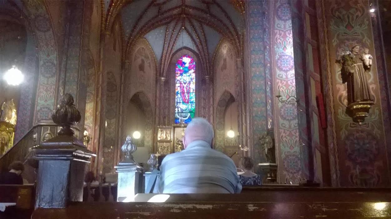 W kościele msza, więc usiadłem w ostatniej ławce.: