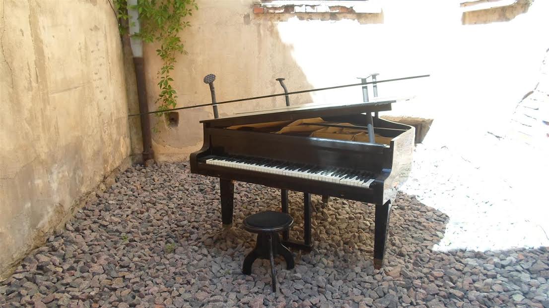 Nieco dalej w zaułku. Fortepian ma w środku głośnik. Właśnie koncertował Chopin.: