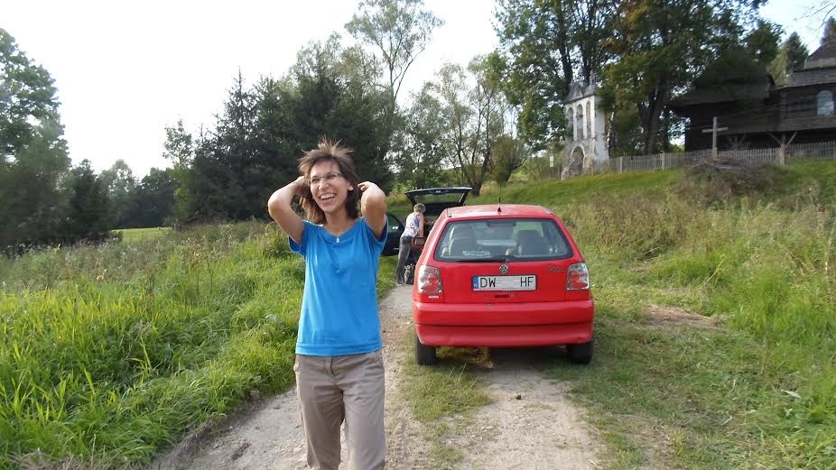 I akcent optymistyczny. Ta pani tak się cieszy, bo pomogliśmy jej wyciągnąć samochód z rowu. Wpakowała się w niego, gdy próbowała nam zrobić miejsce przy cerkiewce w Liskowatem. Stanowczo za dużo tych cerkwi jak na jedne skromne Bieszczady: