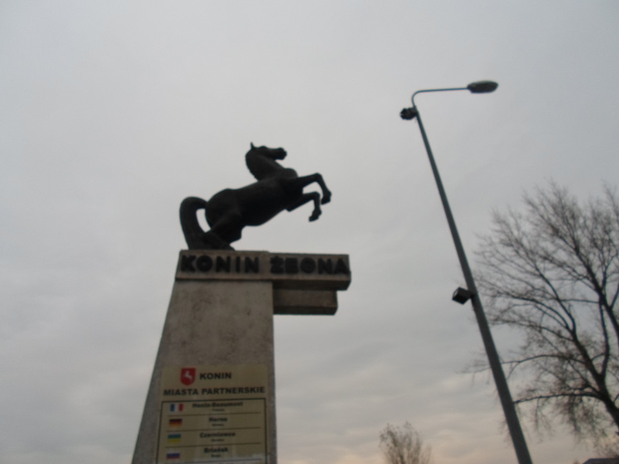 Przy wjeździe do Konina emblemat miasta. Pamiętam, że u progu wolnej Polski rada tego grodu toczyła zacięte spory o to, czy ów koń ma mieć ogon podniesiony czy opuszczony. I – ewentualnie – czy wysoko podniesiony i jak bardzo nisko opuszczony. Jak widać, osiągnięto kompromis.