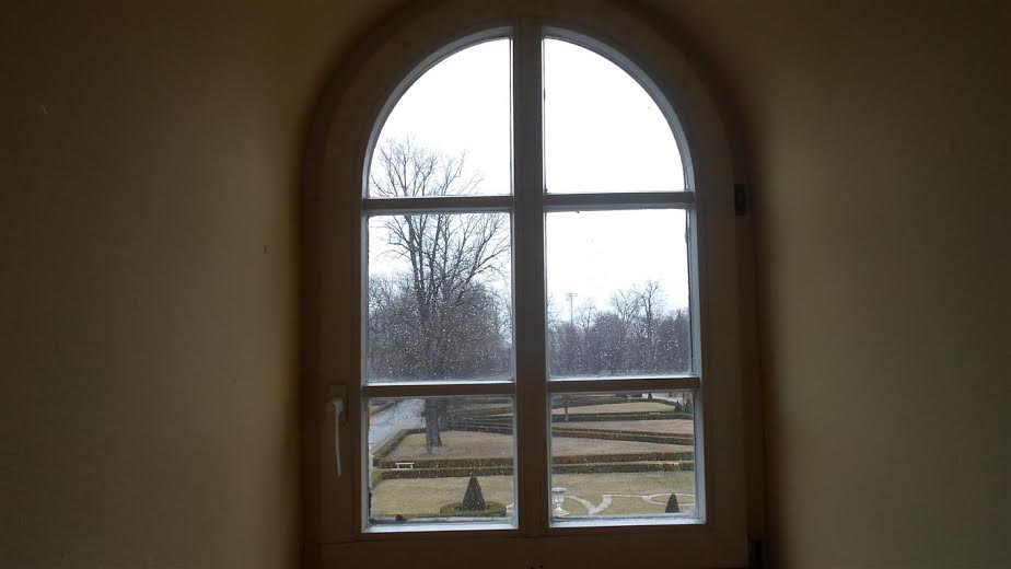 Pałac w Sieniawie. Widok z okna. Rzucało śniegiem. Dzisiaj też.: