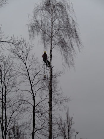 Jeszcze Powązki Wojskowe. Porządki w drzewostanie. Ta brzoza za chwilę będzie brzozą złamaną. Od niej do pomnika ofiar zamachu jest najwyżej 300 metrów…: