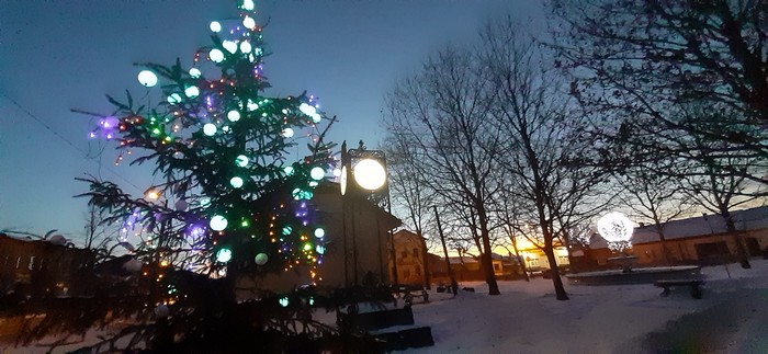 Miasteczko Piotrków Kujawski. Na zdjęciu nie bardzo widać, ale ten zegar na centralnym placu, który swego czasu ktos rozstrzaskał kamieniem, ma już nową tarczę. Oczywiście – wszystko do czasu…