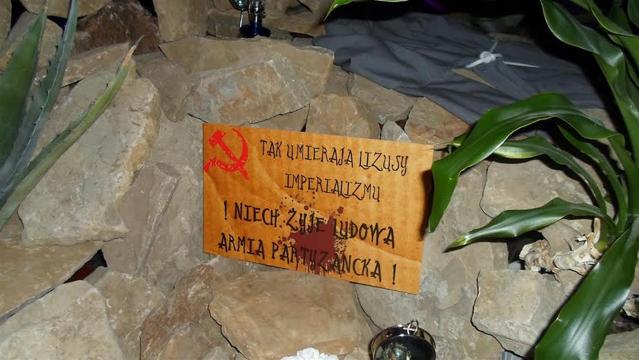 Rzut pałą od Arłamowa jest też Kalwaria Pacławska, na której byłem sto razy. Ale zawsze odkrywam coś nowego. Tym razem w sanktuarium na grobie Pańskim tabliczka, jaką niedawno ultralewicowa partyzantka zostawiła na miejscu egzekucji polskich misjonarzy. Gdzieś w Ameryce Południowej.: