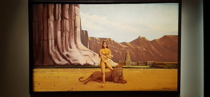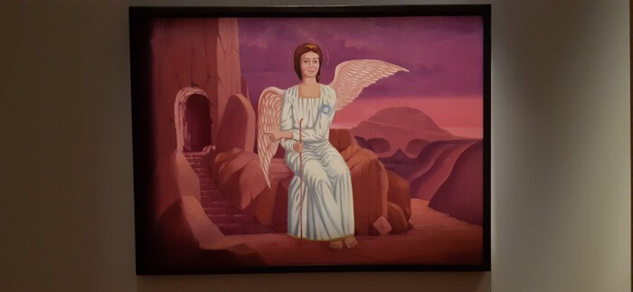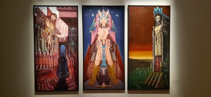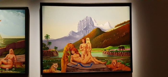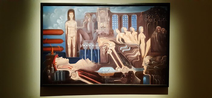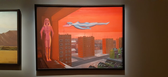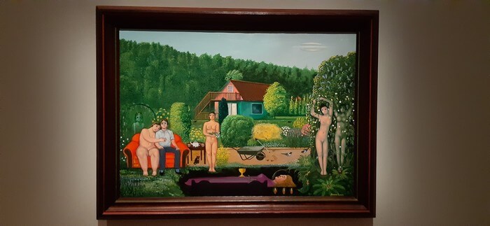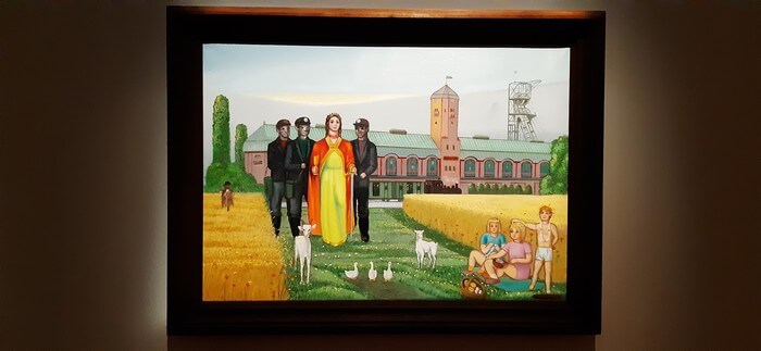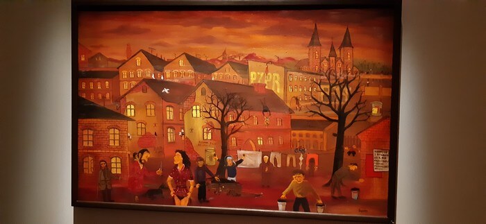 Z trasy. Muzeum w Katowicach. Prace Erwina Sówki. Wiki: „Erwin Sówka ( zm. 21 stycznia 2021) – polski malarz zaliczany do prymitywistów, emerytowany górnik kopalni węgla kamiennego Wieczorek w Janowie, był ostatnim żyjącym twórcą Grupy Janowskiej (gdy z grupy odszedł Teofil Ociepka, wyznaczył go na swojego następcę jako poważnie podchodzącego do okultyzmu, mistyki i śląskiego genius loci)”.: