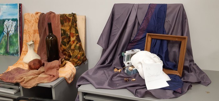 Wczoraj w Kościanie czekam na zakończenie filmu (potem dyskusja) obserwując w pracowni plastycznej martwe natury przygotowane do „odmalowania”. Tak piękne, że muszę ustawić sobie coś podobnego we własnym pokoju.: